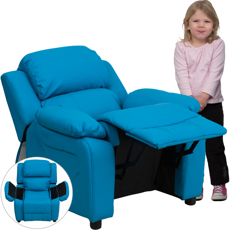 - The child-sized recliner with deluxe padding is a perfect spot for kids to watch TV, play video games or read their favorite book.The chair features plush padding, vinyl upholstery and flip-up storage arms for remote controls, books and game controllers. This sturdy little recliner has a solid hardwood frame and durable upholstery that cleans easily with a damp cloth. It has raised black plastic feet and will hold up to 90 pounds. Designed with safety in mind, it's filled with CA117 Fire retardant foam, and reclines only when a child is seated and the footrest is pulled out one inch.This cozy kids recliner will be a great addition to your living room or your child's bedroom or playroom.