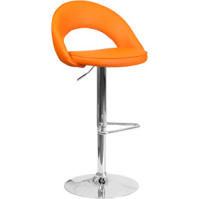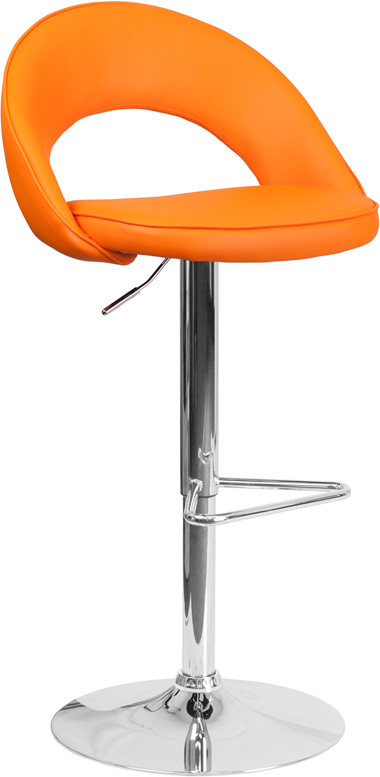 - This contemporary barstool features a rounded back with a decorative zipper trim design. Upholstered in a durable vinyl upholstery, this chair is easy to clean. The height adjustable swivel seat adjusts from counter to bar height with the handle located below the seat. The triangle shaped chrome footrest supports your feet while also providing a contemporary chic design. To help protect your floors, the base features an embedded plastic ring.