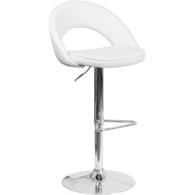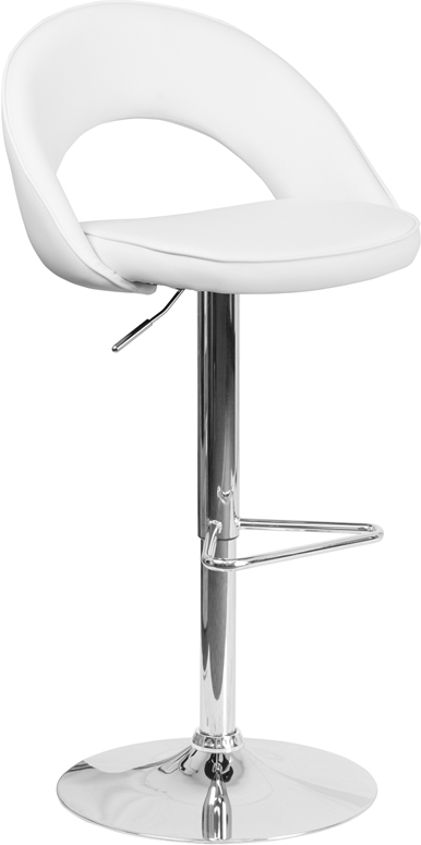 - This contemporary barstool features a rounded back with a decorative zipper trim design. Upholstered in a durable vinyl upholstery, this chair is easy to clean. The height adjustable swivel seat adjusts from counter to bar height with the handle located below the seat. The triangle shaped chrome footrest supports your feet while also providing a contemporary chic design. To help protect your floors, the base features an embedded plastic ring.