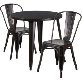 - Complete your dining room, restaurant or patio with this chic table and chair set. This colorful set will add a retro-modern look to your home or eatery. Table features a smooth top and protective rubber floor glides. The stackable bistro chair features plastic caps that prevent the finish from scratching while being stacked. This 3 piece table set is designed for indoor and outdoor settings. For longevity, care should be taken to protect from long periods of wet weather. The possibilities are endless with the multitude of environments in which you can use this table, for both commercial and residential spaces.
