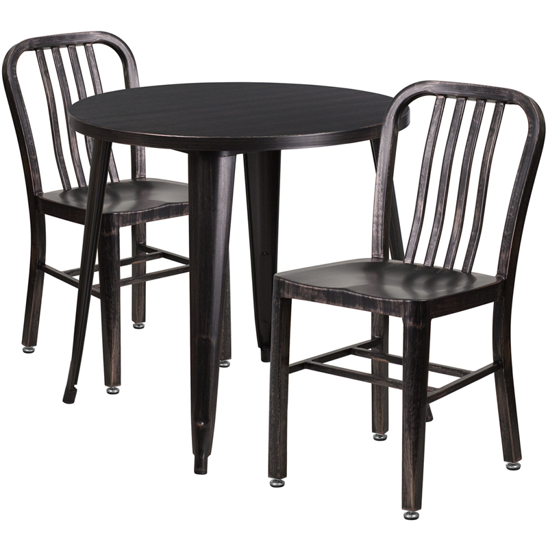 - Complete your dining room, restaurant or patio with this chic table and chair set. This colorful set will add a retro-modern look to your home or eatery. Table features a smooth top and protective rubber floor glides. The industrial style chair features an attractive vertical slat back. This 3 piece table set is designed for indoor and outdoor settings. For longevity, care should be taken to protect from long periods of wet weather. The possibilities are endless with the multitude of environments in which you can use this table, for both commercial and residential spaces.