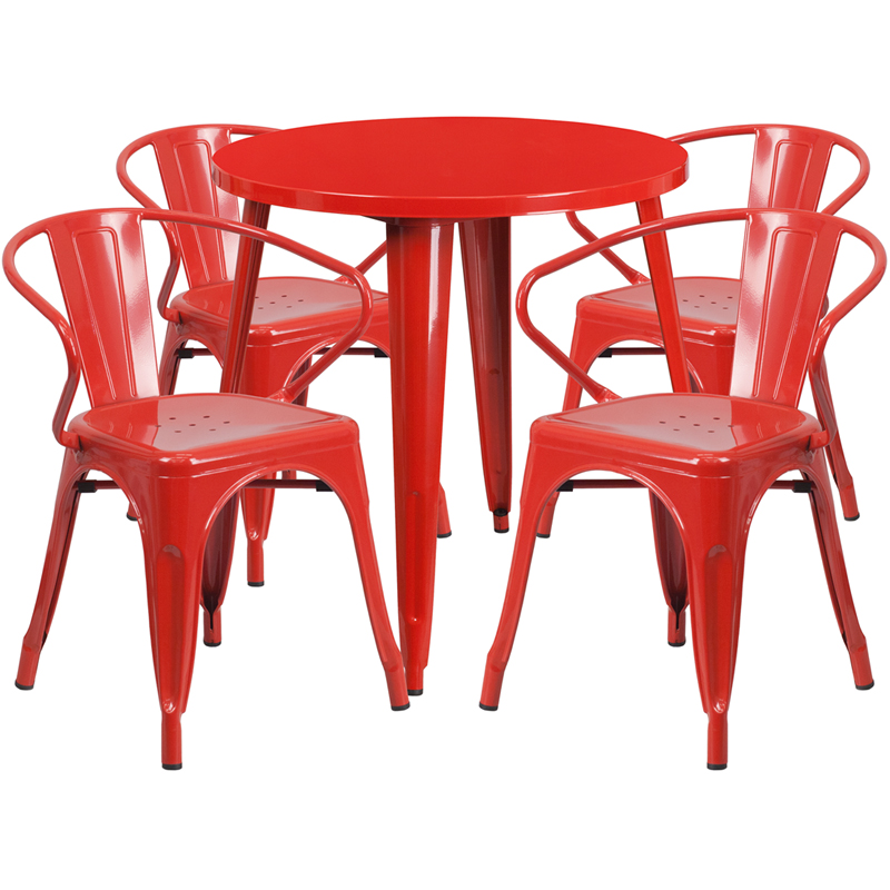 - Complete your dining room, restaurant or patio with this chic table and chair set. This colorful set will add a retro-modern look to your home or eatery. Table features a smooth top and protective rubber floor glides. The stackable bistro chair features plastic caps that prevent the finish from scratching while being stacked. This 5 piece table set is designed for indoor and outdoor settings. For longevity, care should be taken to protect from long periods of wet weather. The possibilities are endless with the multitude of environments in which you can use this table, for both commercial and residential spaces.