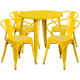 - Complete your dining room, restaurant or patio with this chic table and chair set. This colorful set will add a retro-modern look to your home or eatery. Table features a smooth top and protective rubber floor glides. The stackable bistro chair features plastic caps that prevent the finish from scratching while being stacked. This 5 piece table set is designed for indoor and outdoor settings. For longevity, care should be taken to protect from long periods of wet weather. The possibilities are endless with the multitude of environments in which you can use this table, for both commercial and residential spaces.