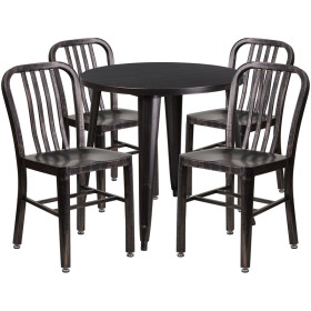 - Complete your dining room, restaurant or patio with this chic table and chair set. This colorful set will add a retro-modern look to your home or eatery. Table features a smooth top and protective rubber floor glides. The industrial style chair features an attractive vertical slat back. This 5 piece table set is designed for indoor and outdoor settings. For longevity, care should be taken to protect from long periods of wet weather. The possibilities are endless with the multitude of environments in which you can use this table, for both commercial and residential spaces.