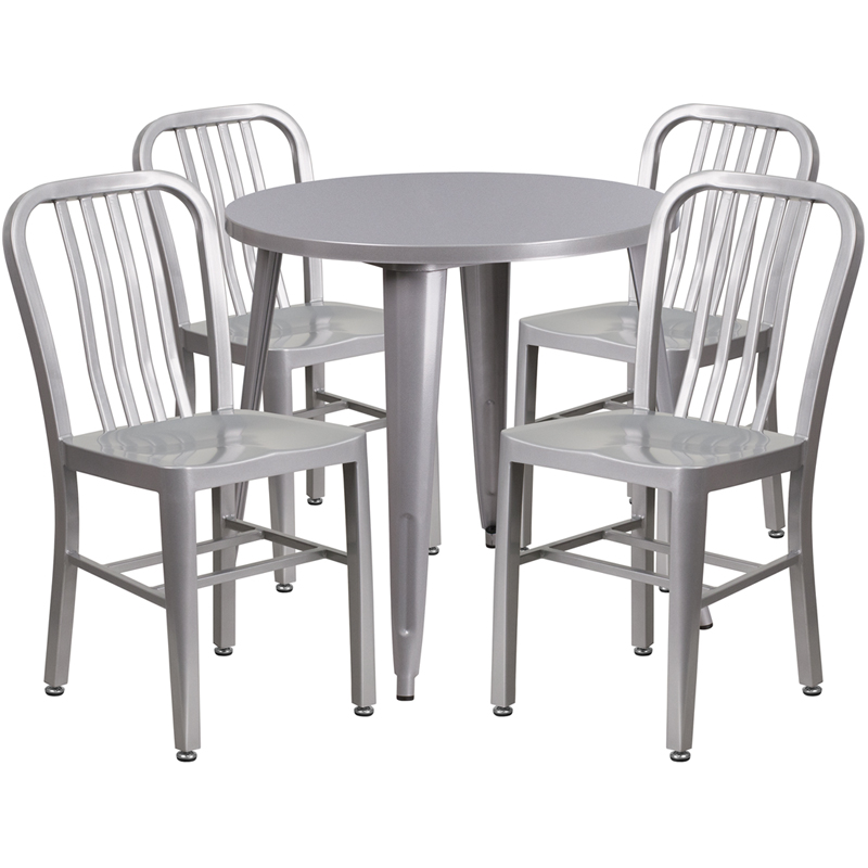 - Complete your dining room, restaurant or patio with this chic table and chair set. This colorful set will add a retro-modern look to your home or eatery. Table features a smooth top and protective rubber floor glides. The industrial style chair features an attractive vertical slat back. This 5 piece table set is designed for indoor and outdoor settings. For longevity, care should be taken to protect from long periods of wet weather. The possibilities are endless with the multitude of environments in which you can use this table, for both commercial and residential spaces.