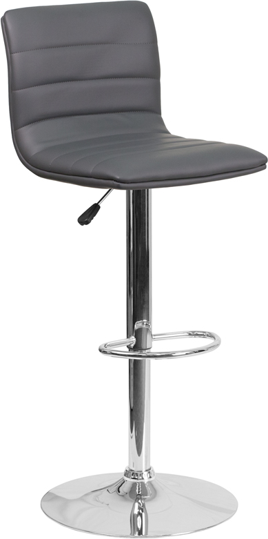 - This modern barstool is upholstered in a durable vinyl upholstery and adjusts from counter to bar height. This armless design is gracefully contoured for your comfort. The height adjustable swivel seat adjusts from counter to bar height with the handle located below the seat. The chrome footrest supports your feet while also providing a contemporary chic design. To help protect your floors, the base features an embedded plastic ring.
