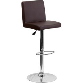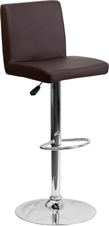 - The brown vinyl, adjustable height barstool is a great fit for your home bar, game room or kitchen island.The seat and back are padded with 2" of CA117 fire retardant foam and upholstered in luxurious brown vinyl. The swivel seat easily adjusts from counter to bar height using the convenient gas lift-handle, located just below the seat. The chrome base and footrest complement the stool's modern design and this stool will hold up to 330 pounds.Designed for residential use, this brown vinyl barstool is an excellent choice when you want a contemporary look for your home.