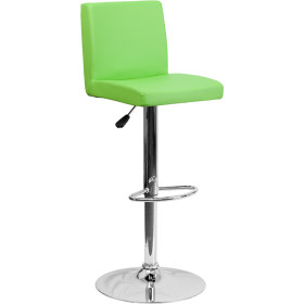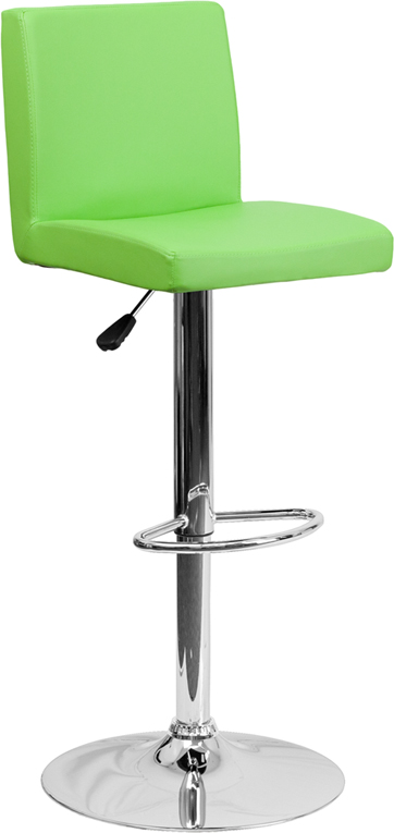 - The green vinyl, adjustable height barstool is a great fit for your home bar, game room or kitchen island.The seat and back are padded with 2" of CA117 fire retardant foam and upholstered in luxurious green vinyl. The swivel seat easily adjusts from counter to bar height using the convenient gas lift-handle, located just below the seat. The chrome base and footrest complement the stool's modern design and this stool will hold up to 330 pounds.Designed for residential use, this green vinyl barstool is an excellent choice when you want a contemporary look for your home.