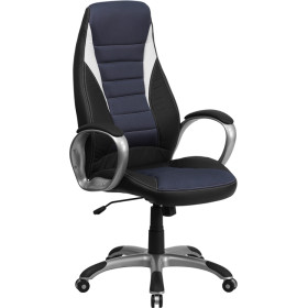 If you're looking for a comfortable chair than you've found it in this contemporary office chair that features an ergonomically designed seat and back. This chair is attractively designed with blue mesh inserts in the back and seat with vinyl surrounding. Finding a comfortable chair is essential when sitting for long periods at a time. Having the support of an ergonomic office chair may help promote good posture and reduce future back problems or pain. High back office chairs have backs extending to the upper back for greater support. The high back design relieves tension in the lower back, preventing long term strain. The waterfall front seat edge removes pressure from the lower legs and improves circulation. Chair easily swivels 360 degrees to get the maximum use of your workspace without strain. The pneumatic adjustment lever will allow you to easily adjust the seat to your desired height. The silver nylon base with black caps prevents feet from slipping when resting on chairs base.