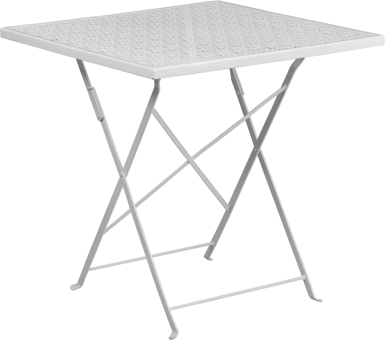 - Brighten up your patio space with this beautiful patio table. The rain flower printed top is very appealing. This table will enhance your bistro, cafe, restaurant, hotel or home patio space. With the convenience of a folding table you can use it as a temporary placement or fold away for storage or cleaning the space. Quickly unfold the table by pulling the center brace. The table was designed for all-weather use making it a great option for indoor and outdoor settings. For longevity, care should be taken to protect from long periods of wet weather.