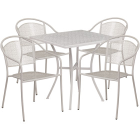 - Brighten up your patio space with this beautiful patio table set. This colorful set will enhance your bistro, cafe, restaurant, hotel or home patio space. The patio chairs stack for storing. The frames are designed for all-weather use making it a great option for indoor and outdoor settings. For longevity, care should be taken to protect from long periods of wet weather. The possibilities are endless with the multitude of environments in which you can use this table, for both commercial and residential spaces.