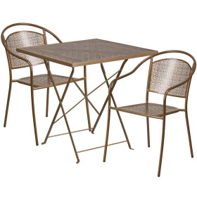 - Brighten up your patio space with this beautiful patio table set. This colorful set will enhance your bistro, cafe, restaurant, hotel or home patio space. With the convenience of a folding table you can use it as a temporary placement or fold away for storage or cleaning the space. Quickly unfold the table by pulling the center brace. The patio chairs stack for storing. The frames are designed for all-weather use making it a great option for indoor and outdoor settings. For longevity, care should be taken to protect from long periods of wet weather. The possibilities are endless with the multitude of environments in which you can use this table, for both commercial and residential spaces.