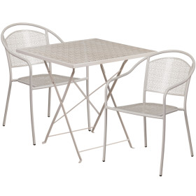 - Brighten up your patio space with this beautiful patio table set. This colorful set will enhance your bistro, cafe, restaurant, hotel or home patio space. With the convenience of a folding table you can use it as a temporary placement or fold away for storage or cleaning the space. Quickly unfold the table by pulling the center brace. The patio chairs stack for storing. The frames are designed for all-weather use making it a great option for indoor and outdoor settings. For longevity, care should be taken to protect from long periods of wet weather. The possibilities are endless with the multitude of environments in which you can use this table, for both commercial and residential spaces.