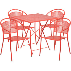 - Brighten up your patio space with this beautiful patio table set. This colorful set will enhance your bistro, cafe, restaurant, hotel or home patio space. With the convenience of a folding table you can use it as a temporary placement or fold away for storage or cleaning the space. Quickly unfold the table by pulling the center brace. The patio chairs stack for storing. The frames are designed for all-weather use making it a great option for indoor and outdoor settings. For longevity, care should be taken to protect from long periods of wet weather. The possibilities are endless with the multitude of environments in which you can use this table, for both commercial and residential spaces.