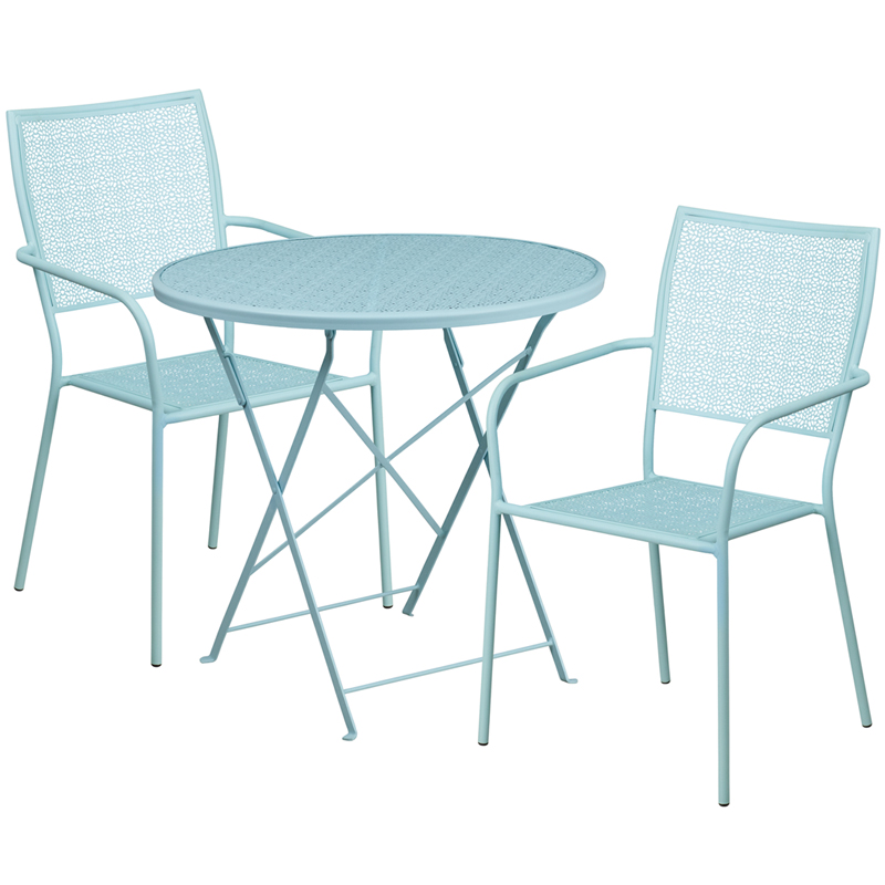 - Brighten up your patio space with this beautiful patio table set. This colorful set will enhance your bistro, cafe, restaurant, hotel or home patio space. With the convenience of a folding table you can use it as a temporary placement or fold away for storage or cleaning the space. Quickly unfold the table by pulling the center brace. The patio chairs stack for storing. The frames are designed for all-weather use making it a great option for indoor and outdoor settings. For longevity, care should be taken to protect from long periods of wet weather. The possibilities are endless with the multitude of environments in which you can use this table, for both commercial and residential spaces.