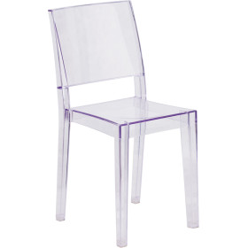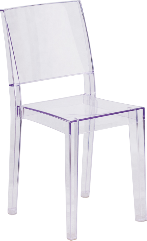 - Create a beautiful and artistic statement with this transparent accent chair. Provide a grand statement and lighten up the room. The transparency of the chair allows it to take up less space visually as with a solid chair. This chair was crafted with an ingenious combination of lightness and strength. Due to its stacking capabilities, elegant design and use in indoor and outdoor locale this chair can be used in diverse environments.