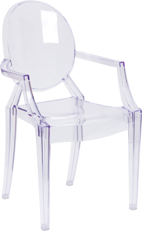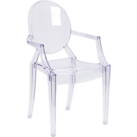 - The transparent ghost chair brings modern design, elegance and function to your home, restaurant and special events.This modern chair with its Louis XVI styling and near invisibility highlights your artwork and other furniture pieces, lightens a crowded space and can make a small room appear larger. Curved arms and a contoured seat make this chair comfortable and its polycarbonate molded structure makes it shock, scratch and water resistant. Protective floor glides protect your floor by sliding smoothly when you need to move these beautiful chairs.Designed for indoor-outdoor and commercial use, the understated ghost chair is a classic accent chair that highlights almost any decor without blocking the view.