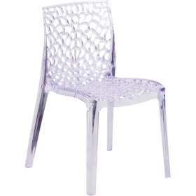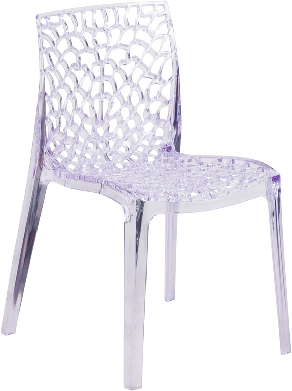 - Create a beautiful and artistic statement with this transparent accent chair. You'll fall in love with this chair with its intricate cut-out design. The transparency of the chair allows it to take up less space visually as with a solid chair. This chair was crafted with an ingenious combination of lightness and strength. Due to its stacking capabilities, elegant design and use in indoor and outdoor locale this chair can be used in diverse environments.