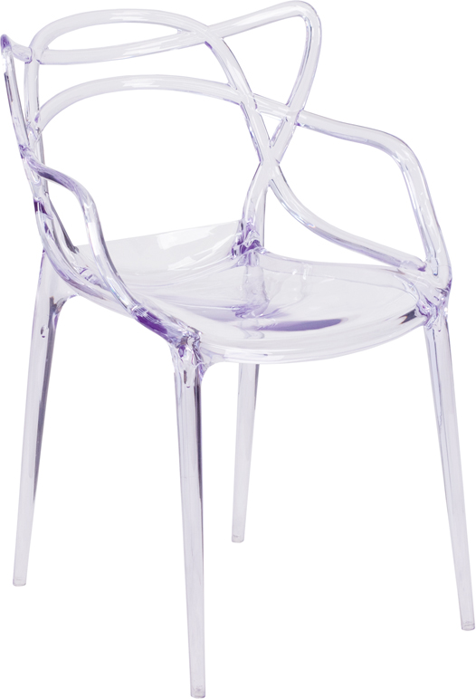 - This beautiful work of art has transformed into seating that will captivate everyone. Provide a grand statement and lighten up the room. The transparency of the chair allows it to take up less space visually as with a solid chair. This chair was crafted with an ingenious combination of lightness and strength. Due to its stacking capabilities, elegant design and use in indoor and outdoor locale this chair can be used in diverse environments.