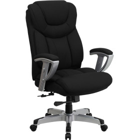 - Finding a comfortable chair is essential when sitting for long periods at a time. Big & Tall office chairs are designed to accommodate larger and taller body types. This chair has been tested to hold a capacity of up to 400 lbs., offering a broader seat and back width. High back office chairs have backs extending to the upper back for greater support. The high back design relieves tension in the lower back, preventing long term strain. This office chair features plenty of thick, plush padding to provide greater support. The waterfall front seat edge removes pressure from the lower legs and improves circulation. Chair easily swivels 360 degrees to get the maximum use of your workspace without strain. The pneumatic adjustment lever will allow you to easily adjust the seat to your desired height. The height and width adjustable armrests take the pressure off the shoulders and the neck, which minimizes the risk of pain. The silver nylon capped metal base with black caps prevents feet from slipping when resting on chairs base.