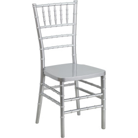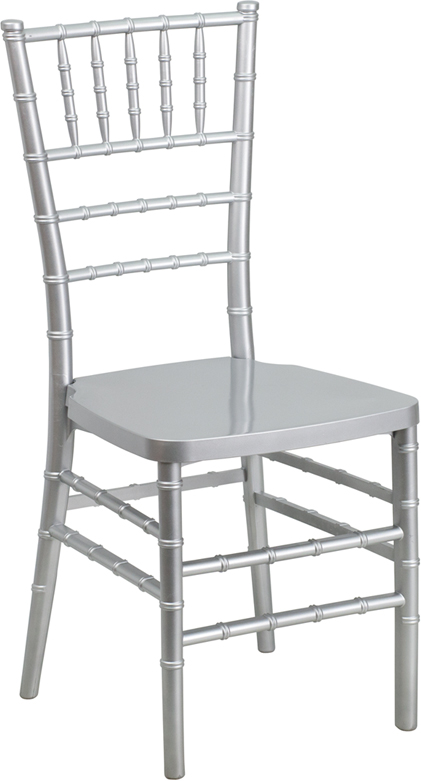 - The Silver Resin Chiavari Chair is ideal for weddings, banquets and special events from casual to the most elegant. Constructed of ultra-strong resin and polycarbonate, this chair is very lightweight, yet extremely strong and wobble-free. The color of the frame is the same all the way through, so you don't have to worry about cosmetic nicks and scratches ruining the appearance. It's UV treated to help prevent fading and discoloration. No re-painting or staining is ever needed; your chairs will look great for years to come. These beautiful chairs ship fully assembled, can be stacked 8 high for storage.With its durable, lightweight construction and elegant styling, this Chiavari chair will be the prime seating choice for all of your special events, whether indoors or outside.