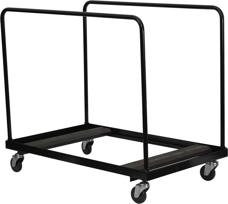 - The Black Folding Table Dolly for Round Folding Tables will save you time during set up and break down at all your special events.This commercial grade dolly, with a high gloss black finish, is constructed of heavy duty .125 inch thick, angle shaped steel with dual support bracing. A 1-inch diameter tubular handle provides support for the tables and a convenient grip for you. This dolly is designed to hold eight to ten, 60" round folding tables. Four, 4 inch polyolefin wheels on swivel casters facilitate movement of heavy loads across most floor surfaces.A must have for banquet halls, hotels and conference centers, this folding table dolly will give you hassle-free mobility to transport and store your special event tables.