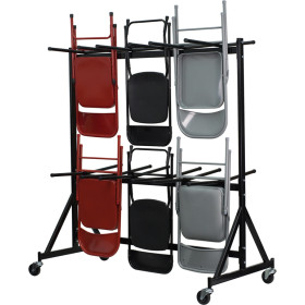 - The Hanging Folding Chair Truck will save you time during set up and break down at all your special events.This chair truck is designed to store folding chairs on both sides for maximum utilization of space. It features a 17-gauge welded steel frame with a black powder coated finish. Rubber stoppers on each chair hanger help keep your walls scratch-free and prevent chairs from sliding off. Four, 3 inch polyolefin swivel casters allow for easy mobility on most types of floor surfaces.A must have for banquet halls, hotels and conference centers, this folding chair truck will give you hassle-free mobility to transport and store your special event chairs.