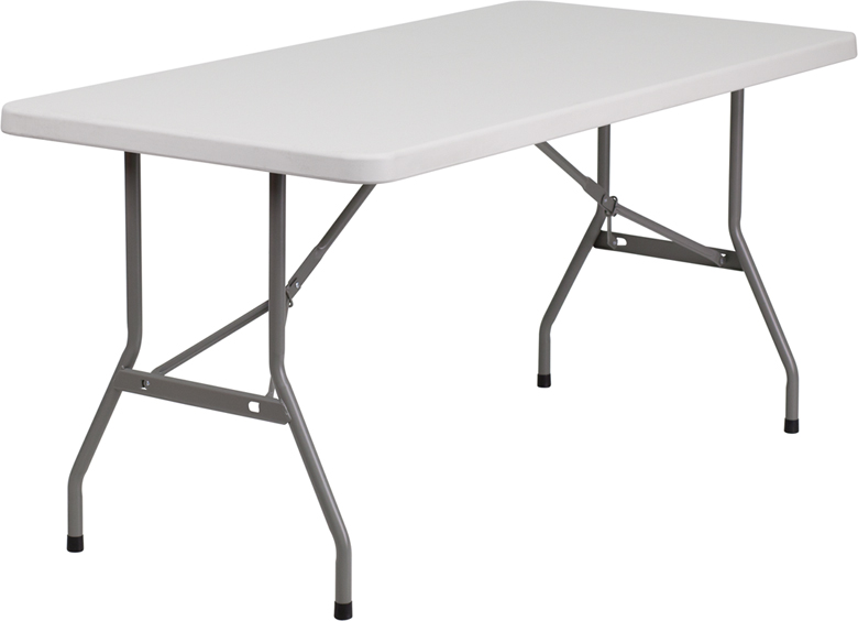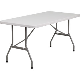 - This rectangular folding table is 5 feet long and is beneficial in a multitude of settings that include banquet halls, conference centers, cafeterias, schools and in the home. The table can be used as a temporary seating solution or be setup for everyday use. The durable blow molded top is low maintenance and cleans easily. The table legs fold under the table to make storage more convenient and for better portability. This table is commercial grade to withstand everyday use in the hospitality industry.