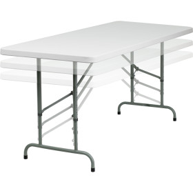 This rectangular folding table is 6 feet long and is beneficial in a multitude of settings that include banquet halls, conference centers, cafeterias, schools and in the home. The table can be used as a temporary seating solution or be setup for everyday use. This table is also height adjustable to conform to a range of users. The durable blow molded top is low maintenance and cleans easily. The table legs fold under the table to make storage more convenient and for better portability. This table is commercial grade to withstand everyday use in the hospitality industry.