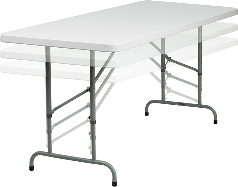 - This rectangular folding table is 6 feet long and is beneficial in a multitude of settings that include banquet halls, conference centers, cafeterias, schools and in the home. The table can be used as a temporary seating solution or be setup for everyday use. This table is also height adjustable to conform to a range of users. The durable blow molded top is low maintenance and cleans easily. The table legs fold under the table to make storage more convenient and for better portability. This table is commercial grade to withstand everyday use in the hospitality industry.