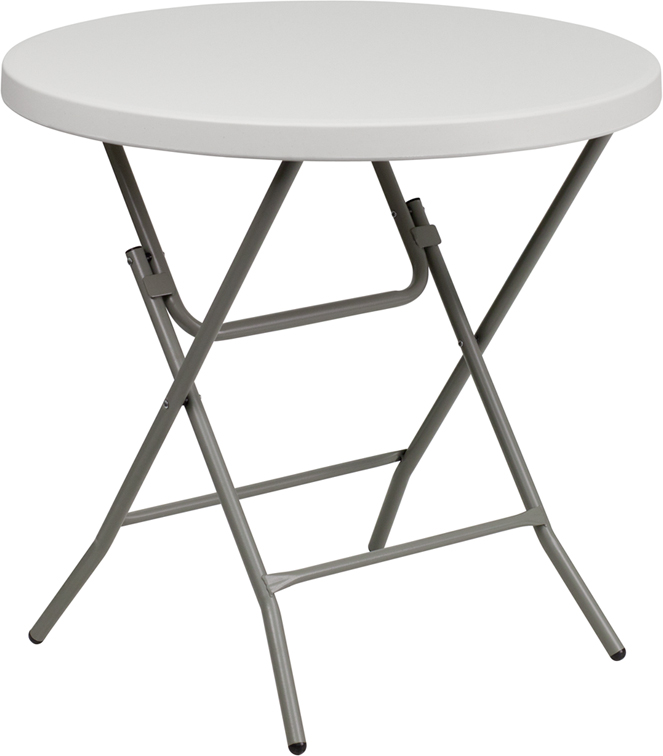 - This petite sized folding table can be used in banquet halls, cafeterias, or in the home. This table is a great solution for temporary setups for displaying food or other small items. The durable blow molded top is low maintenance and cleans easily. Easy to fold legs fold flat under table top to make storage more convenient and for better portability. This table is commercial grade to withstand everyday use in the hospitality industry.