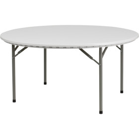 This round folding table is 5 feet long and is beneficial in a multitude of settings that include banquet halls, conference centers, cafeterias, schools and in the home. The table can be used as a temporary seating solution or be setup for everyday use. The durable blow molded top is low maintenance and cleans easily. The table legs fold under the table to make storage more convenient and for better portability. This table is commercial grade to withstand everyday use in the hospitality industry.