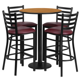 - No need to buy in pieces, this complete Bar Height Table and Stool set will save you time! This set includes an elegant Natural Laminate Table Top, Round Base and 4 Metal Ladder Back Barstools. Use this setup in Bars, Banquet Halls, Restaurants, Break Room/Cafeteria Settings or any other social gathering. Mix in Bar Height Tables with standard height tables for a more varied seating selection. This Commercial Grade Table Set will last for years to come with its heavy duty construction.