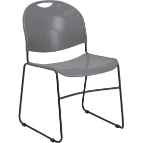 - This indoor-outdoor stack chair will add distinctive style and surprising comfort to your office, home or outdoor dining area.The plastic seat and back are infused with a no-fade material to keep them looking good for years to come. The chair has an ergonomically contoured design to reinforce healthy posture, reducing back strain and muscle fatigue. It features a carrying handle cutout that makes it easy to move and stack these lightweight chairs up to 35-high to transport and store. A smooth powder coat finish covers the metal sled base frame that features a front cross-brace and it will hold up to 880 pounds. Plastic floor glides protect your floor by sliding smoothly, allowing you to easily arrange and rearrange the chairs.Line these chairs up for a uniform look in your conference center, classroom or hotel lobby, or stack them for additional seating in your restaurant or cafeteria.
