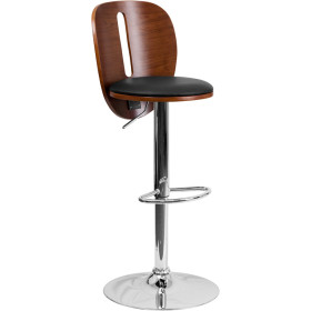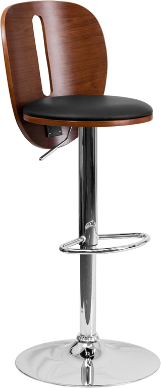 - Beautiful and elegant describe the bentwood style barstool that's accented with a slot cutout for a contemporary flair. This stool is complemented with a comfortable vinyl padded seat and a height adjustable swivel seat that adjusts from counter to bar height with the handle located below the seat. The base and footrest have a chrome finish to complement the chair's modern design. To help protect your floors, the base features an embedded plastic ring.