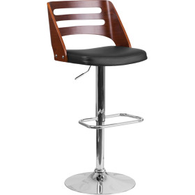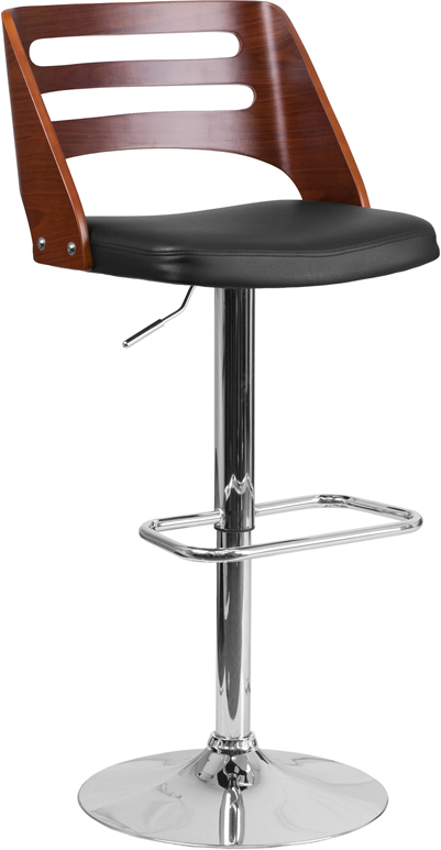 - Beautiful and elegant describe the bentwood style barstool that's accented with a cutout back for a contemporary flair. This stool is complemented with a comfortable vinyl padded seat and a height adjustable swivel seat that adjusts from counter to bar height with the handle located below the seat. The base and footrest have a chrome finish to complement the chair's modern design. To help protect your floors, the base features an embedded plastic ring.