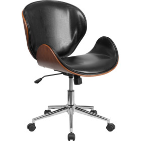 - This office chair features a beautiful walnut bentwood frame with glossy black leather upholstery. This chair is sure to make an impression and become the focal point in your office or home office. A mid-back office chair offers support to the mid-to-upper back region. The contoured backrest provides firm back support. Chair easily swivels 360 degrees to get the maximum use of your workspace without strain. The pneumatic adjustment lever will allow you to easily adjust the seat to your desired height.