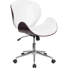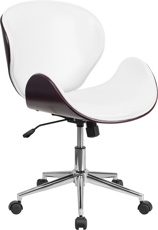 - This office chair features a beautiful mahogany bentwood frame with glossy white leather upholstery. This chair is sure to make an impression and become the focal point in your office or home office. A mid-back office chair offers support to the mid-to-upper back region. The contoured backrest provides firm back support. Chair easily swivels 360 degrees to get the maximum use of your workspace without strain. The pneumatic adjustment lever will allow you to easily adjust the seat to your desired height.