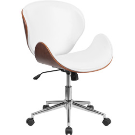 - This office chair features a beautiful walnut bentwood frame with glossy white leather upholstery. This chair is sure to make an impression and become the focal point in your office or home office. A mid-back office chair offers support to the mid-to-upper back region. The contoured backrest provides firm back support. Chair easily swivels 360 degrees to get the maximum use of your workspace without strain. The pneumatic adjustment lever will allow you to easily adjust the seat to your desired height.