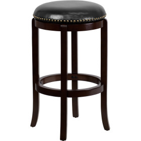 - This wood bar height stool will make a beautiful statement in the home when wanting to achieve an elegant arrangement. The backless stool will not only look great in the kitchen, but will be perfect in the pool or game room. The 360 degree swivel seat allows you to swing around effortlessly. The durable wood frame is stabilized with the included foot ring. The floor glides help protect your floors and ensure smooth gliding. This stool is adorned with decorative nail trimming on the seat and bowed out legs. This stool will offer comfort along with its attractive design.