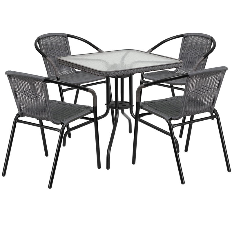 - Arrange your perfect outdoor space with this glass table set. This set will enhance your bistro, cafe, restaurant, hotel or home patio space. The rippled designer glass top has a smooth surface for keeping items level. The rattan edge band adds just the right touch to set it apart. The lightweight chair features a curved back, and a comfortable rattan seat. For easy storing and cleaning purposes these chairs stack up to 23 chairs high. This set was designed for all-weather use making it a great option for indoor and outdoor settings. For longevity, care should be taken to protect from long periods of wet weather. Whether you are just starting your business or upgrading your furniture this set will complete the look.