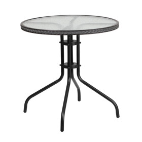 - Create the perfect relaxing or entertainment environment with this patio table. This glass table will enhance your bistro, cafe, restaurant, hotel or home patio space. The ripple designed table top features a smooth surface for keeping items level. The designer rattan edge band adds an appealing touch. The table was designed for all-weather use making it a great option for indoor and outdoor settings. For longevity, care should be taken to protect from long periods of wet weather.