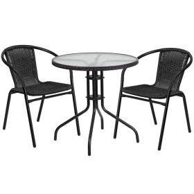 - Arrange your perfect outdoor space with this glass table set. This set will enhance your bistro, cafe, restaurant, hotel or home patio space. The rippled designer glass top has a smooth surface for keeping items level. The rattan edge band adds just the right touch to set it apart. The lightweight chair features a curved back, and a comfortable rattan seat. For easy storing and cleaning purposes these chairs stack up to 23 chairs high. This set was designed for all-weather use making it a great option for indoor and outdoor settings. For longevity, care should be taken to protect from long periods of wet weather. Whether you are just starting your business or upgrading your furniture this set will complete the look.