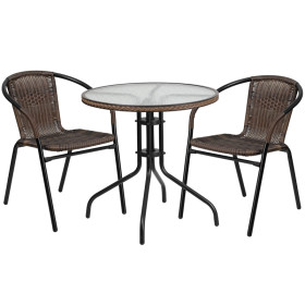 - Arrange your perfect outdoor space with this glass table set. This set will enhance your bistro, cafe, restaurant, hotel or home patio space. The rippled designer glass top has a smooth surface for keeping items level. The rattan edge band adds just the right touch to set it apart. The lightweight chair features a curved back, and a comfortable rattan seat. For easy storing and cleaning purposes these chairs stack up to 23 chairs high. This set was designed for all-weather use making it a great option for indoor and outdoor settings. For longevity, care should be taken to protect from long periods of wet weather. Whether you are just starting your business or upgrading your furniture this set will complete the look.