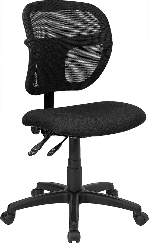 - Mesh office chairs can keep you more productive throughout your work day with its comfort and ventilated design. The breathable mesh material allows air to circulate to keep you cool while sitting. Finding a comfortable chair is essential when sitting for long periods at a time. The mid-back design offers support to the mid-to-upper back region. The contoured backrest provides firm back support allowing your back to rest comfortably. The locking back angle adjustment lever changes the angle of your torso to reduce disc pressure. The waterfall front seat edge removes pressure from the lower legs and improves circulation. Chair easily swivels 360 degrees to get the maximum use of your workspace without strain. The pneumatic adjustment lever will allow you to easily adjust the seat to your desired height. From behind the desk to the meeting room this chair can provide a seamless addition to your work space.