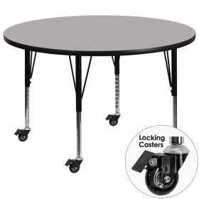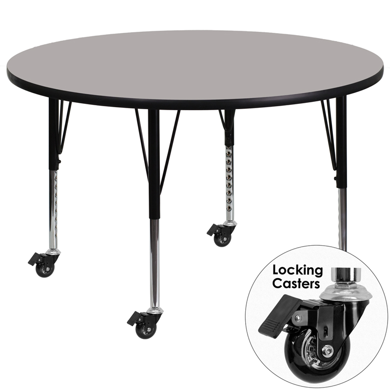 Flash Furniture's Preschool XU-A48-RND-GY-H-P-CAS-GG warp resistant high pressure laminate round activity table features a 1.25" top and a high pressure laminate work surface. This Round High Pressure Laminate activity table provides an extremely durable (no mar, no burn, no stain) work surface that is versatile enough for everything from computers to projects or group lessons. This mobile activity table enhances collaborative learning by allowing students to quickly group tables together and lock the wheels for non-movement. Sturdy steel legs adjust from 17.5" - 25.5" high and have a brilliant chrome finish. The 1.25" thick particle board top also incorporates a protective underside backing sheet to prevent moisture absorption and warping. T-mold edge banding provides a durable and attractive edging enhancement that is certain to withstand the rigors of any classroom environment. This model is featured in a beautiful Grey finish that will enhance the beauty of any school setting.