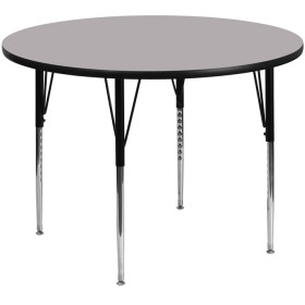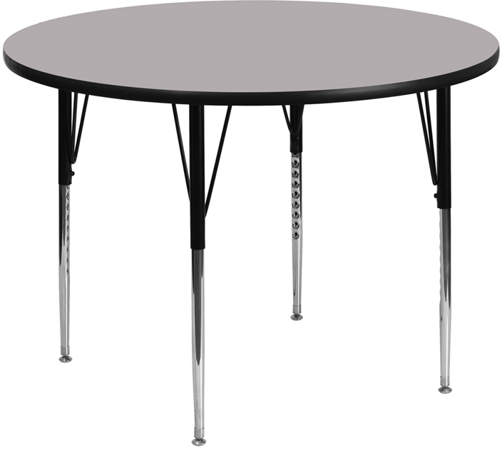 - Flash Furniture's XU-A48-RND-GY-T-A-GG warp resistant thermal fused laminate round activity table features a 1.125" top and a thermal fused laminate work surface. This Round Laminate activity table provides a durable work surface that is versatile enough for everything from computers to projects or group lessons. Sturdy steel legs adjust from 21.125" - 30.125" high and have a brilliant chrome finish. The 1.125" thick particle board top also incorporates a protective underside backing sheet to prevent moisture absorption and warping. T-mold edge banding provides a durable and attractive edging enhancement that is certain to withstand the rigors of any classroom environment. Glides prevent wobbling and will keep your work surface level. This model is featured in a beautiful Grey finish that will enhance the beauty of any school setting.