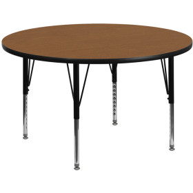 - Flash Furniture's Preschool XU-A48-RND-OAK-T-P-GG warp resistant thermal fused laminate round activity table features a 1.125" top and a thermal fused laminate work surface. This Round Laminate activity table provides a durable work surface that is versatile enough for everything from computers to projects or group lessons. Sturdy steel legs adjust from 16.125" - 25.125" high and have a brilliant chrome finish. The 1.125" thick particle board top also incorporates a protective underside backing sheet to prevent moisture absorption and warping. T-mold edge banding provides a durable and attractive edging enhancement that is certain to withstand the rigors of any classroom environment. Glides prevent wobbling and will keep your work surface level. This model is featured in a beautiful Oak finish that will enhance the beauty of any school setting.