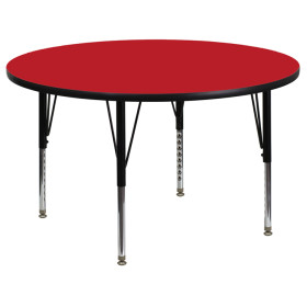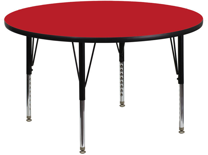 - Flash Furniture's Preschool XU-A48-RND-RED-H-P-GG warp resistant high pressure laminate round activity table features a 1.25" top and a high pressure laminate work surface. This Round High Pressure Laminate activity table provides an extremely durable (no mar, no burn, no stain) work surface that is versatile enough for everything from computers to projects or group lessons. Sturdy steel legs adjust from 16.25" - 25.25" high and have a brilliant chrome finish. The 1.25" thick particle board top also incorporates a protective underside backing sheet to prevent moisture absorption and warping. T-mold edge banding provides a durable and attractive edging enhancement that is certain to withstand the rigors of any classroom environment. Glides prevent wobbling and will keep your work surface level. This model is featured in a beautiful Red finish that will enhance the beauty of any school setting.