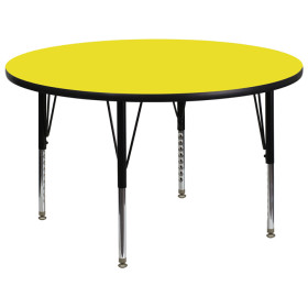 Flash Furniture's Preschool XU-A48-RND-YEL-H-P-GG warp resistant high pressure laminate round activity table features a 1.25" top and a high pressure laminate work surface. This Round High Pressure Laminate activity table provides an extremely durable (no mar, no burn, no stain) work surface that is versatile enough for everything from computers to projects or group lessons. Sturdy steel legs adjust from 16.25" - 25.25" high and have a brilliant chrome finish. The 1.25" thick particle board top also incorporates a protective underside backing sheet to prevent moisture absorption and warping. T-mold edge banding provides a durable and attractive edging enhancement that is certain to withstand the rigors of any classroom environment. Glides prevent wobbling and will keep your work surface level. This model is featured in a beautiful Yellow finish that will enhance the beauty of any school setting.